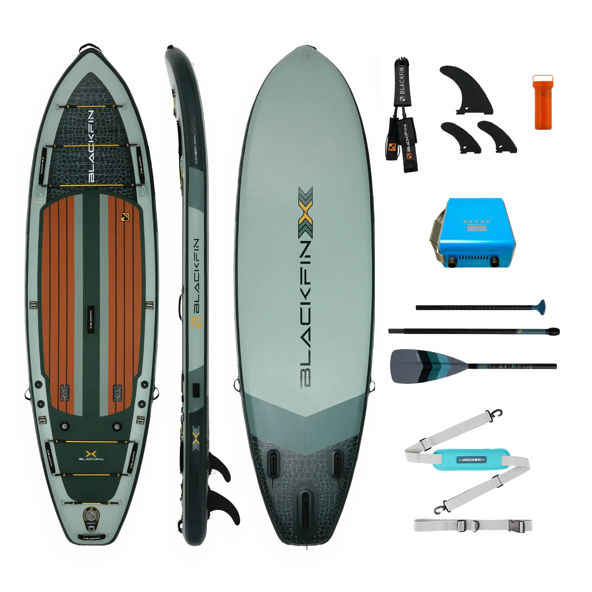 The BLACKFIN MODEL X is a premium inflatable fishing SUP that offers unmatched stability and durability, now with captivating marine life-inspired designs. Its wide 35-inch platform makes balancing effortless, especially for fishing from a SUP. Constructed with triple-layer PVC and a carbon rail for exceptional rigidity, this BLACKFIN iSUP provides a solid feel on the water. Dual bungee storage areas accommodate all your gear for camping, cruising, and fishing. Engineered for serious paddlers, the BLACKFIN MODEL X excels in stability across lakes, rivers, bays, and the ocean, providing the perfect wide and stable base for avid anglers.